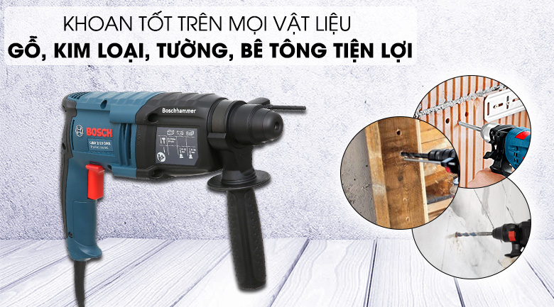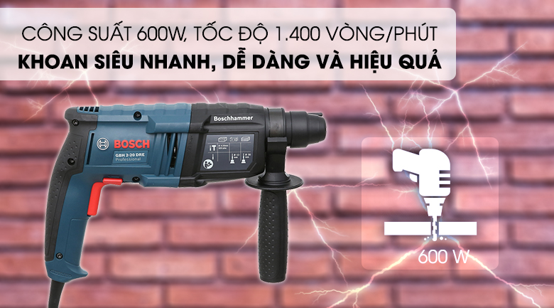 Máy khoan Bosch GBH 2-20 DRE 600W là dụng cụ cầm tay có thể khoan được trên mọi vật liệu như: gỗ, kim loại, tường, lớp bê tông cứng (có cốt thép) dễ dàng.