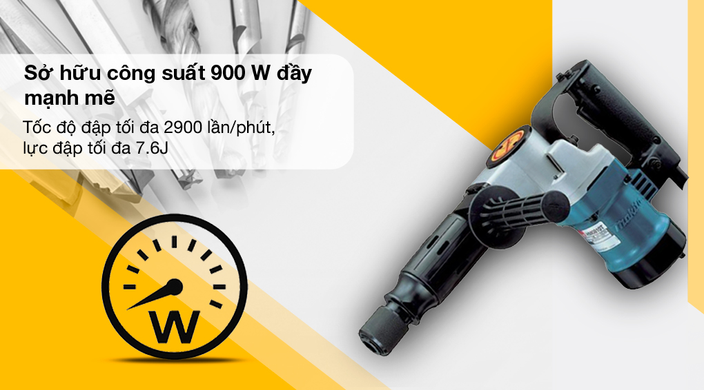 Máy đục bê tông công suất 900W, tốc độ đập tùy chỉnh tốt từ 0-2900 lần/phút với lực đập tối đa 7.6J giúp dễ dàng khoan đục hoặc phá các kết cấu bê tông, đá, gạch cứng, giảm tiêu hao sức lực và gia tăng tốc độ công việc.