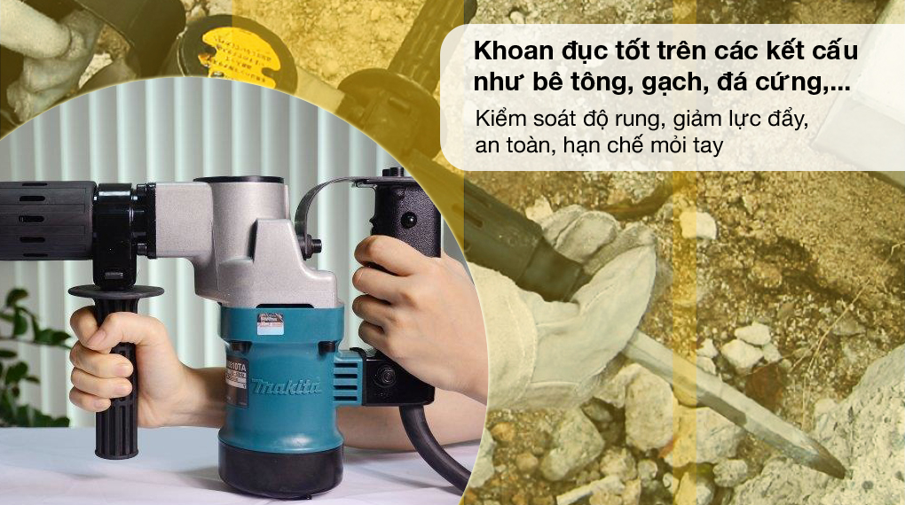 Tóm lại, với thiết kế thông minh, hiện đại và hoạt động hiệu quả trên lực đục phá mạnh mẽ, máy đục bê tông dùng điện Makita HM0810TA 900W sẽ hỗ trợ các dòng máy khoan Makita thông thường ở những công việc cần sức công phá lớn, là lựa chọn tuyệt vời giúp bạn hoàn thành các công việc liên quan đến sửa chữa và đục khoét bê tông nhanh hơn, an toàn và ít tốn sức hơn.