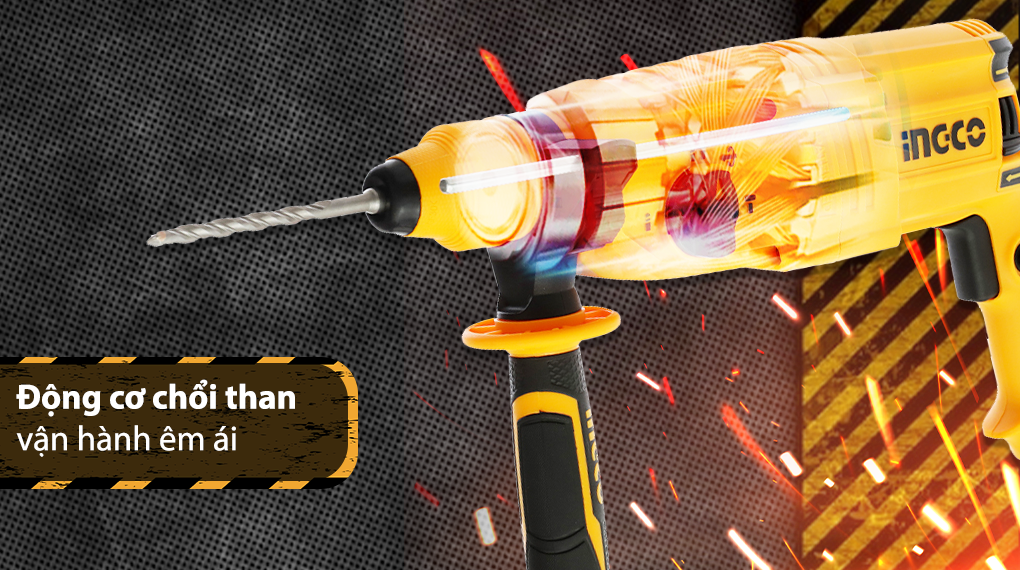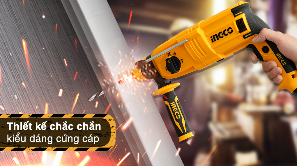 - Máy khoan búa Ingco mang kiểu dáng nhỏ gọn giúp khoan dễ dàng ở nơi chật hẹp. Vỏ máy được gia công bằng chất liệu cao cấp, chịu lực và cách điện tốt, đảm bảo sự an toàn cho người dùng. Bên ngoài phủ lớp sơn màu vàng bắt mắt, tạo sự tươi mới cho cả ngày làm việc.