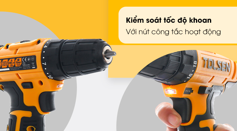 Trong quá trình sử dụng người dùng có thể kiểm soát tốc độ khoan của máy khoan xoay Tolsen này phù hợp với nhu cầu công việc bằng cách nhấn giữ theo mức độ mạnh hoặc nhẹ nút công tắc ngay phần thân máy.