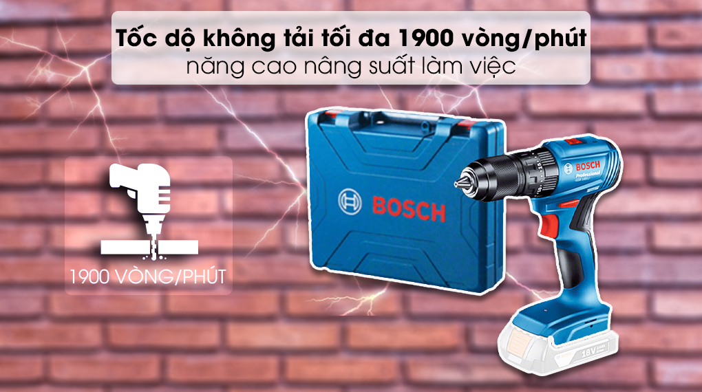 Máy khoan vặn vít pin Bosch sở hữu tốc độ không tải tối đa 1900 vòng/phút góp phần nâng cao năng suất làm việc.