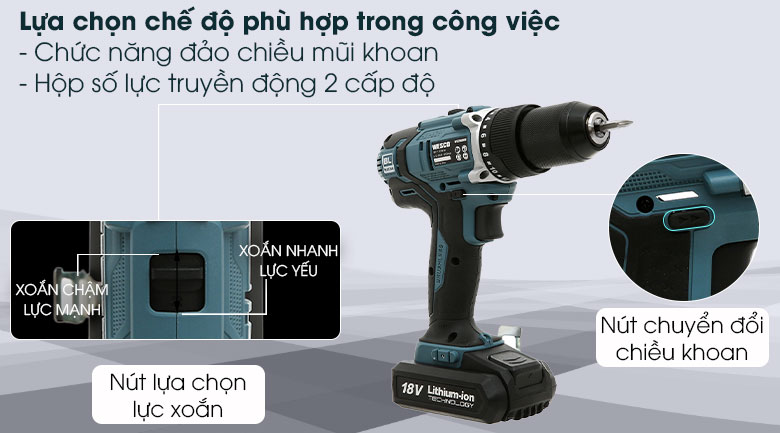 Máy khoan pin Wesco này được trang bị chế độ đảo chiều khoan giúp việc bắn, tháo ốc vít trở nên dễ dàng.