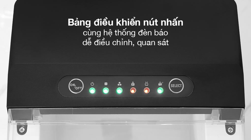 Máy dùng bảng điều khiển nút nhấn kết hợp đèn báo, thao tác khá trực quan và dễ làm quen. Người dùng có thể bật/tắt thiết bị, chọn cỡ đá nhỏ hoặc lớn, đồng thời chọn chế độ vệ sinh thông qua nút select khi máy ở chế độ chờ.