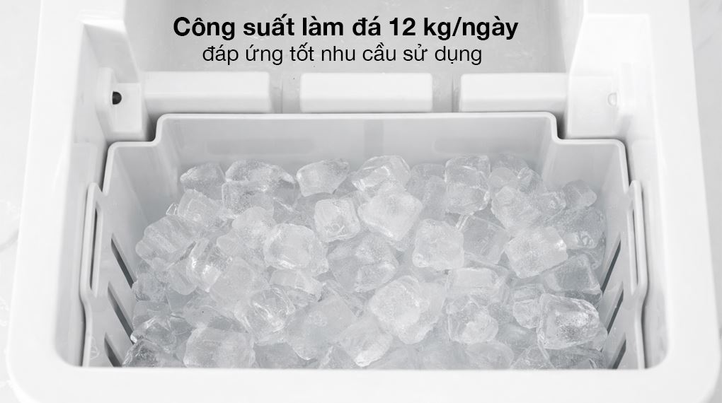 Tổng công suất làm đá đạt 12 kg/ngày, đáp ứng tốt nhu cầu sử dụng trong gia đình, văn phòng nhỏ hoặc những buổi tụ họp có dùng nhiều nước lạnh. Đây là điểm thực tế vì máy có thể chủ động cung cấp đá theo từng đợt, thay vì phụ thuộc hoàn toàn vào ngăn đá tủ lạnh.