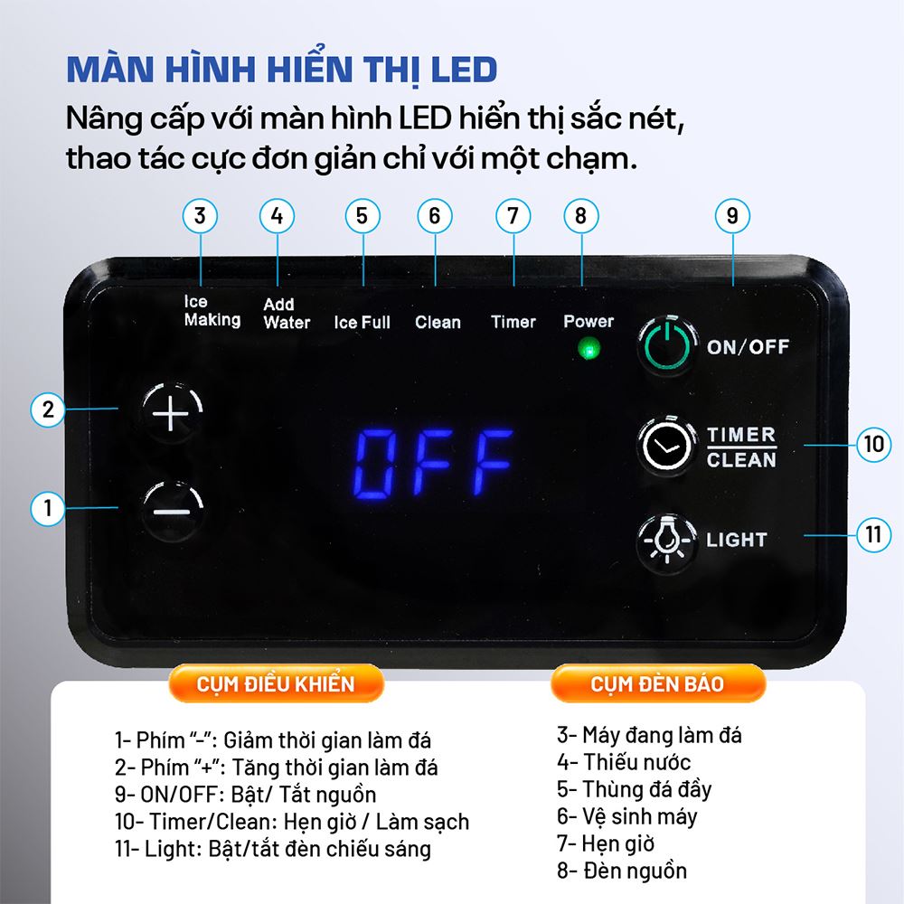 Máy được trang bị bảng điều khiển cảm ứng hiện đại, tích hợp màn hình LED sắc nét, hiển thị rõ ràng các thông số và chế độ làm việc. Người dùng có thể thao tác đơn giản chỉ với một chạm để lựa chọn chế độ đá, hẹn giờ hoặc kích hoạt chế độ vệ sinh tự động.