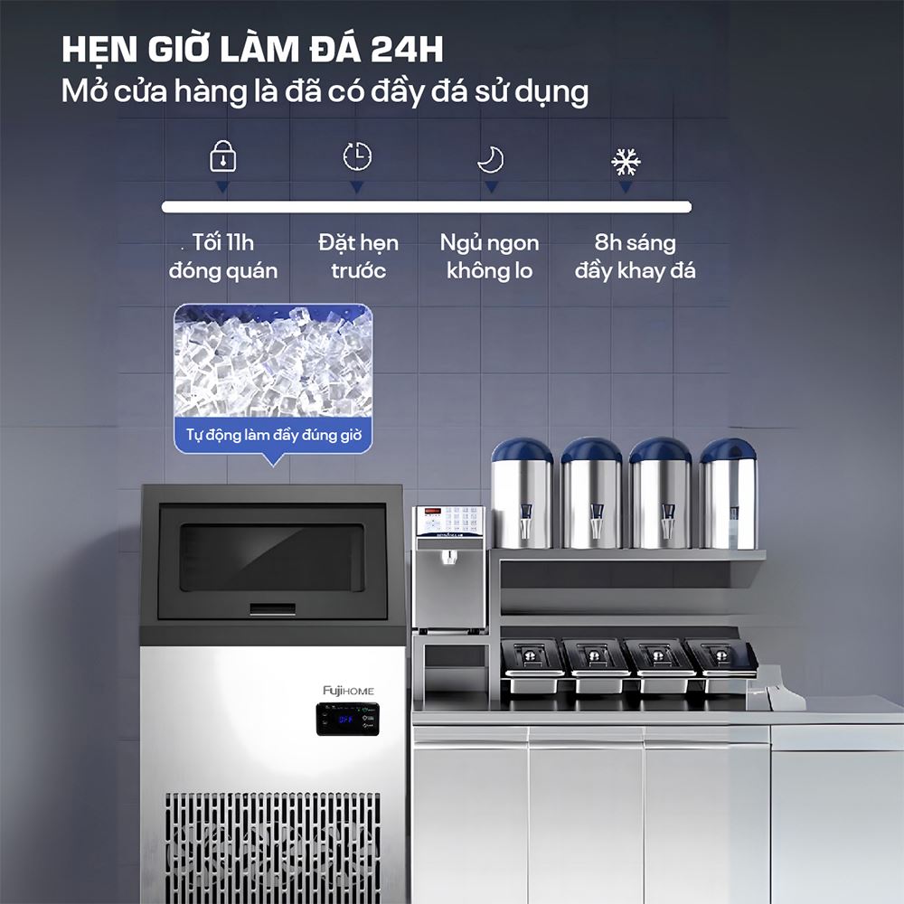 Máy cũng được thiết kế với tính năng an toàn cao, tự động ngắt khi ngăn đá đầy hoặc bình chứa hết nước. Hệ thống cảnh báo trực quan giúp người dùng dễ dàng theo dõi và chủ động xử lý.