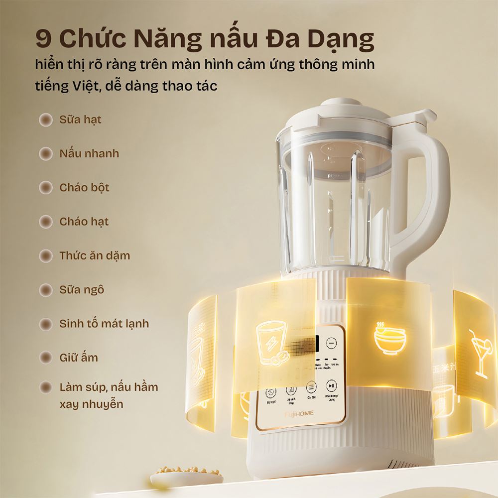 Bảng điều khiển cảm ứng của Fujihome SM01A là điểm nhấn công nghệ, với màn hình màu menu 3D trực quan, giúp người dùng dễ dàng lựa chọn 9 chức năng nấu cài đặt sẵn. Từ sữa hạt thơm lừng, cháo bột mịn màng, thức ăn dặm bổ dưỡng cho bé, đến sữa ngô, sinh tố mát lạnh, súp hay các món hầm, máy đều có thể thực hiện một cách hoàn hảo. Chức năng nấu nhanh tiện lợi cùng tính năng giữ ấm đảm bảo bạn luôn có những bữa ăn nóng hổi, sẵn sàng bất cứ lúc nào.
