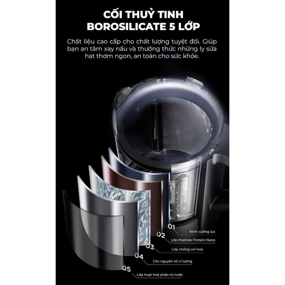 Cối xay nấu được làm từ thủy tinh Borosilicate 5 lớp cao cấp, bền bỉ, chịu nhiệt tốt và an toàn cho sức khỏe. Với dung tích lớn 1.75 lít, máy có thể làm ra khoảng 9 ly sữa, đáp ứng nhu cầu sử dụng cho cả đại gia đình.