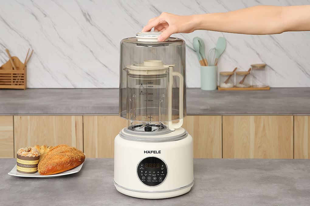 Máy làm sữa hạt Hafele HS-B151NW trang bị nắp giảm ồn, xay nấu êm hơn buổi sáng, nấu sữa hạt, cháo hay súp mà không ảnh hưởng sinh hoạt trong nhà.