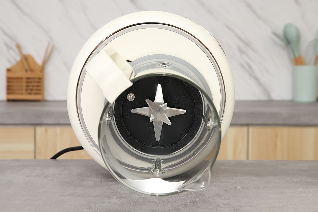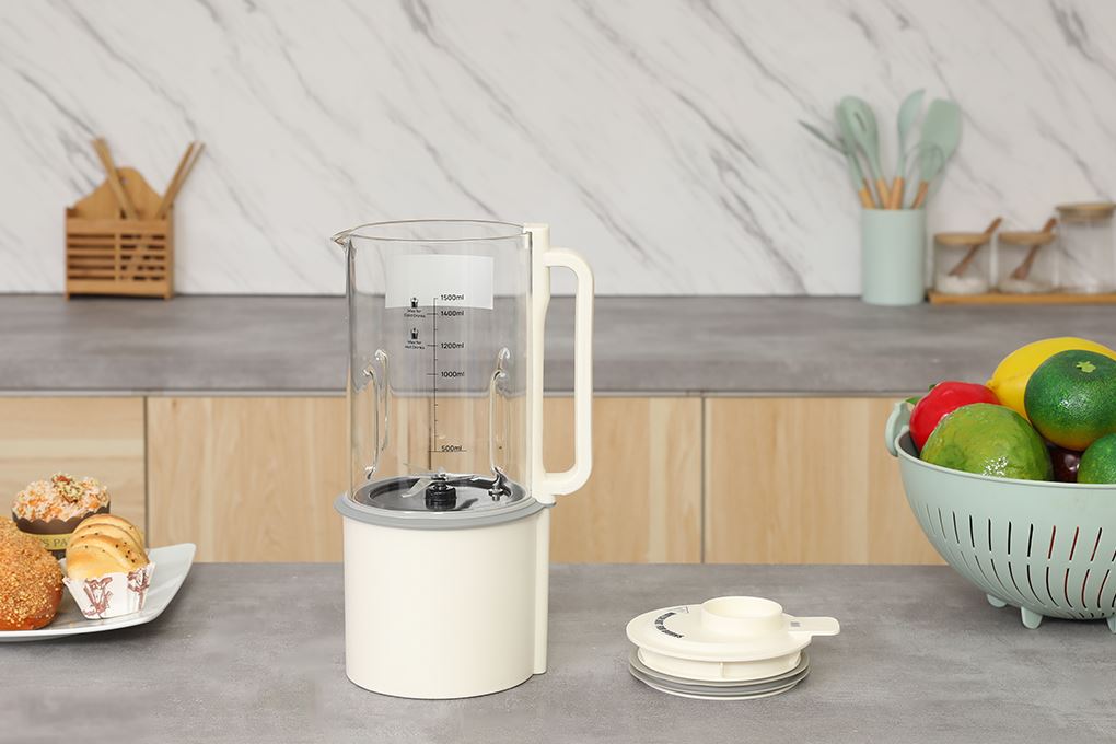 HS-B151NW gây thiện cảm ngay từ cái nhìn đầu tiên với tông màu be nhẹ nhàng, dễ hòa vào nhiều phong cách bếp từ hiện đại đến tối giản. Cối thủy tinh dung tích 1.5 lít trong suốt, có vạch chia rõ ràng, giúp bạn chủ động cân đong nước và quan sát quá trình xay nấu bên trong.