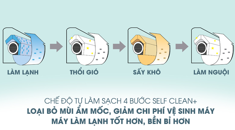 Chiếc máy lạnh Inverter này còn được trang bị chức năng tự làm sạch. Với chức năng này, máy sẽ tự động hong khô dàn lạnh sau mỗi lần hoạt động, loại bỏ môi trường ẩm, ngăn chặn nấm mốc gây mùi hôi khó chịu phát sinh. Đồng thời góp phần tiết kiệm tối đa chi phí làm vệ sinh định kì cho máy lạnh.
