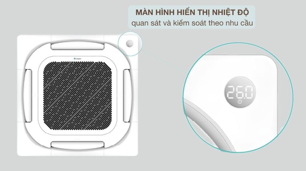 Thiết bị được thiết kế theo dạng điều hòa âm trần hiện đại giúp tối ưu không gian lắp đặt khi phần thân máy được giấu hoàn toàn phía trên trần, chỉ để lộ mặt nạ bên dưới. Kiểu dáng mặt nạ vuông cân đối tạo cảm giác hài hòa, góp phần nâng cao tính thẩm mỹ cho các không gian yêu cầu sự chuyên nghiệp như văn phòng, trung tâm hội nghị hay nhà hàng.