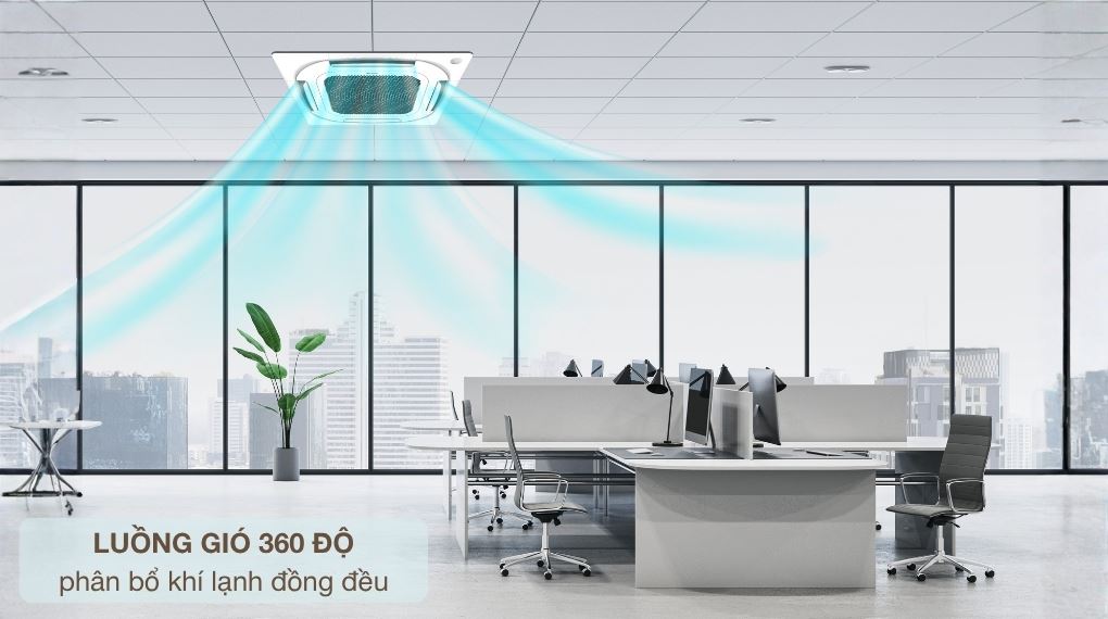 Dàn lạnh dạng cassette mang lại lợi thế về khả năng phân bổ khí lạnh đồng đều trong không gian rộng. Điều hòa vận hành êm, hạn chế tối đa tiếng ồn phát sinh, phù hợp với môi trường cần sự yên tĩnh.