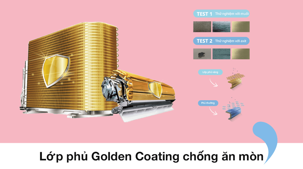 Máy lạnh được cấu tạo từ ống đồng dẫn gas cùng lá tản nhiệt nhôm phủ lớp Golden Coating chống ăn mòn, dàn nóng có độ bền cao, hạn chế tác động từ mưa nắng và hơi muối biển.