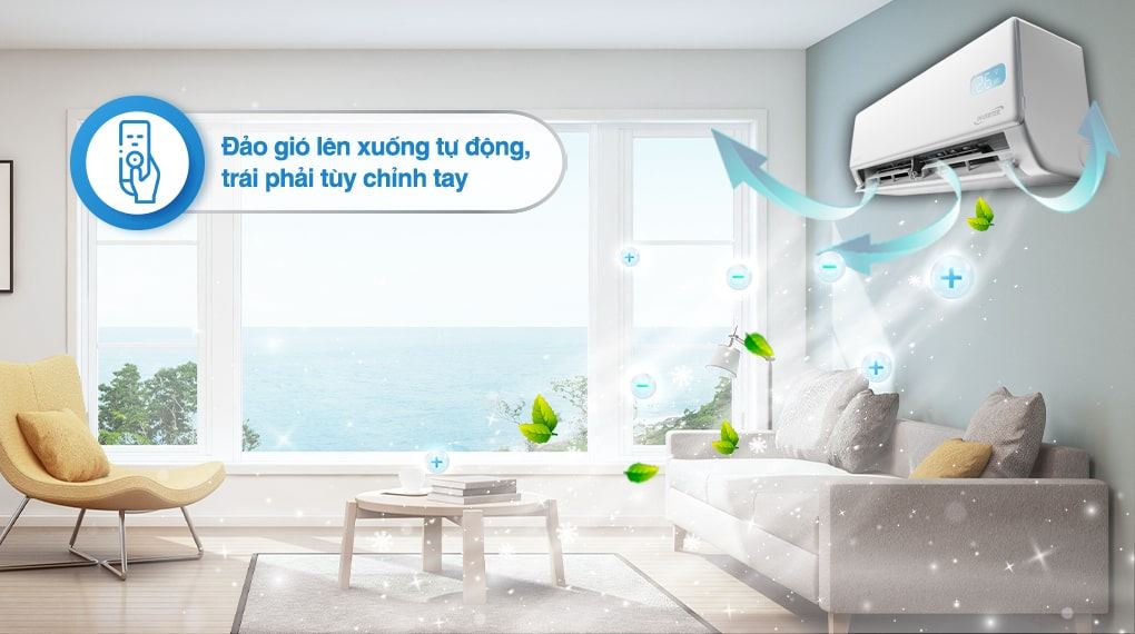 Máy lạnh được trang bị hệ thống cánh đảo gió lên/xuống tự động, giúp phân bổ khí lạnh đồng đều khắp không gian. Kết hợp với khả năng chỉnh tay hướng gió trái phải, người dùng có thể linh hoạt điều chỉnh luồng gió theo ý muốn.