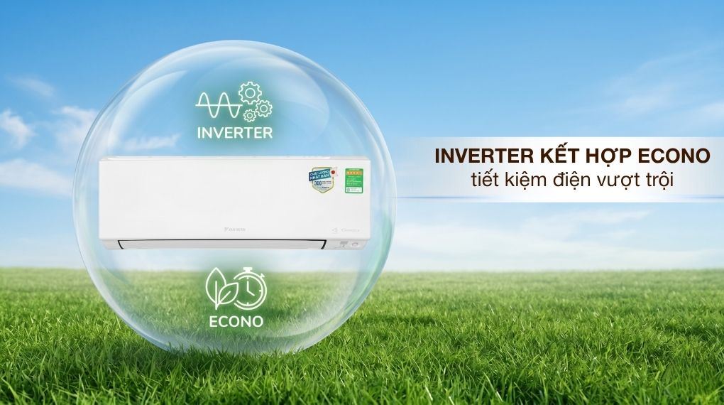Điều hòa tiết kiệm điện hiệu quả nhờ sự kết hợp giữa công nghệ Inverter và chế độ Econo. Công nghệ Inverter điều chỉnh công suất theo nhiệt độ thực tế, giúp hạn chế hao phí điện năng, trong khi Econo tối ưu mức tiêu thụ khi không cần làm lạnh cao nhưng vẫn đảm bảo không gian mát mẻ cho người dùng.