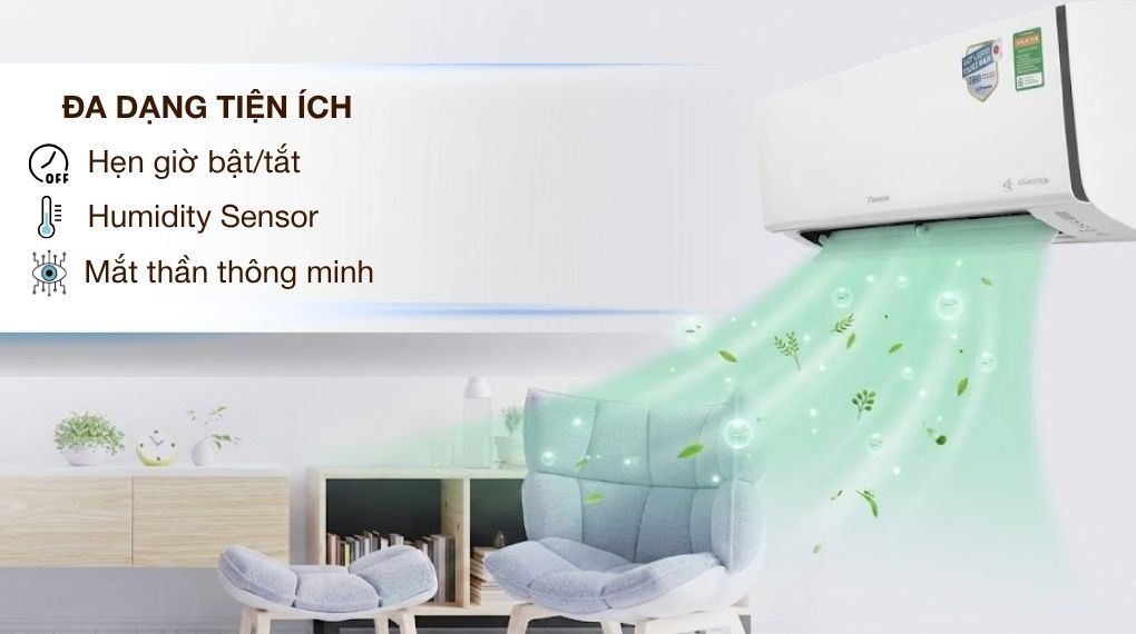 Điều hòa 12300 BTU này sử dụng cơ chế đảo gió lên xuống tự động kết hợp tùy chỉnh trái phải bằng tay, giúp luồng khí lan tỏa đều hơn, đem lại cảm giác dễ chịu ở mọi vị trí trong phòng.