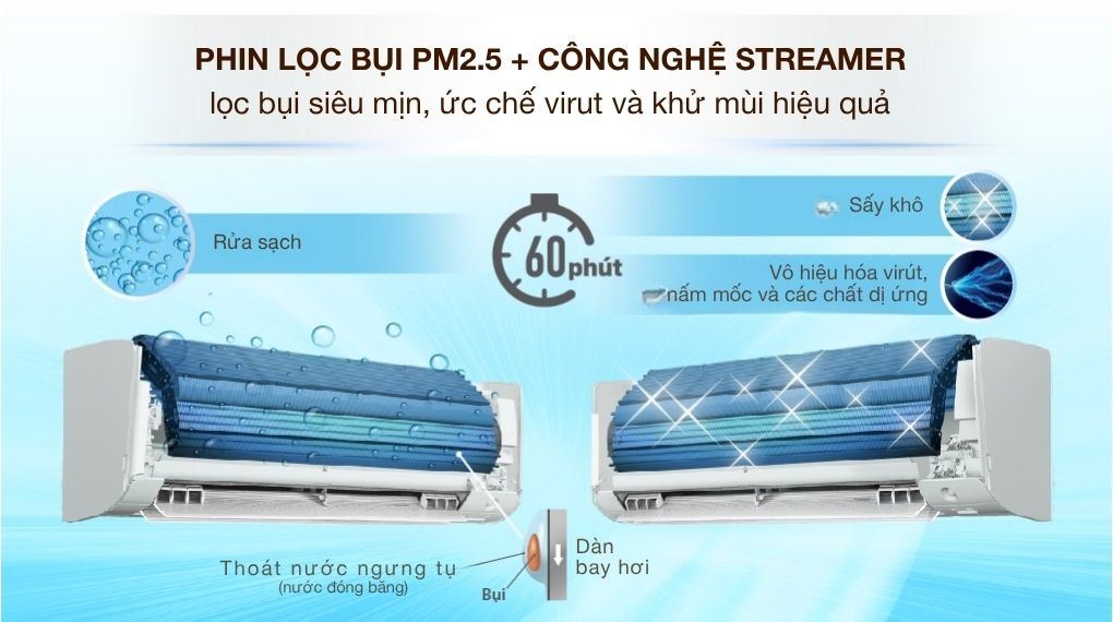 Daikin FTHF25XVMV ứng dụng công nghệ Streamer giúp giảm mùi và hạn chế vi khuẩn trong không khí, hỗ trợ không gian phòng dễ chịu hơn khi sử dụng hằng ngày. Kết hợp với phin lọc Enzyme Blue tích hợp lọc bụi mịn PM2.5, máy giúp giữ lại bụi nhỏ và các tác nhân gây dị ứng, phù hợp cho môi trường sinh hoạt kín hoặc khu vực có chất lượng không khí kém.