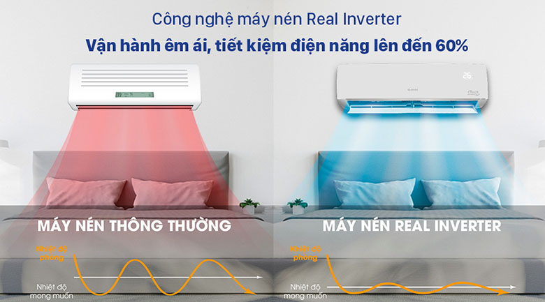 Dàn lạnh Gree sở hữu công nghệ biến tần Real Inverter với máy nén biến tần có thể hoạt động được ở tần số cực thấp, vừa hoạt động bền bỉ, kiểm soát nhiệt độ một cách chính xác nhất, vừa mang lại hiệu quả tiết kiệm điện vượt trội đến hơn 60%.