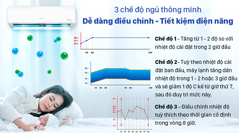 Với 3 chế độ ngủ, bạn có thể chủ động điều chỉnh nhiệt độ thích hợp với nhu cầu sử dụng của từng thành viên trong gia đình. Điều này giúp mang lại cho bạn giấc ngủ ngon và sâu hơn, không bị thức giấc lúc nửa đêm vì quá lạnh, đảm bảo sức khỏe cho cả gia đình.