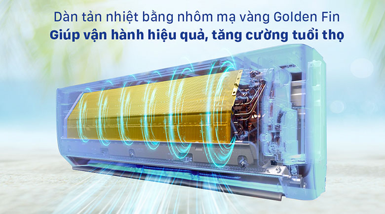 Dàn lạnh có dàn tản nhiệt bằng nhôm được phủ lớp chống ăn mòn mạ vàng Golden Fin. Nhờ lớp phủ này, máy lạnh có thể hoạt động bền bỉ, có khả năng chống ăn mòn muối biển cao, nâng cao tuổi thọ cho máy lạnh.