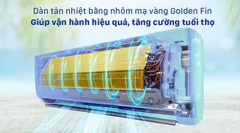 Dàn tản nhiệt của dàn lạnh này được làm bằng nhôm phủ lớp chống ăn mòn mạ vàng Golden Fin. Nhờ lớp phủ này, máy lạnh có thể hoạt động bền bỉ, có khả năng chống ăn mòn muối biển cao, nâng cao tuổi thọ cho máy lạnh.