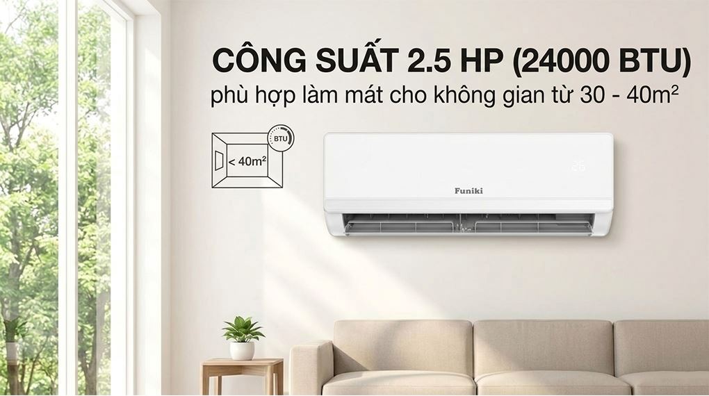 Máy lạnh Funiki Inverter 2.5 HP HIC24TMM-6 có công suất 2.5 HP (24000 BTU), phù hợp sử dụng trong không gian có diện tích từ 30 - 40m² như phòng khách, phòng sinh hoạt chung hoặc phòng làm việc rộng. Công suất này giúp thiết bị đáp ứng nhu cầu làm mát cho những khu vực có diện tích lớn hơn so với các dòng máy lạnh công suất nhỏ.