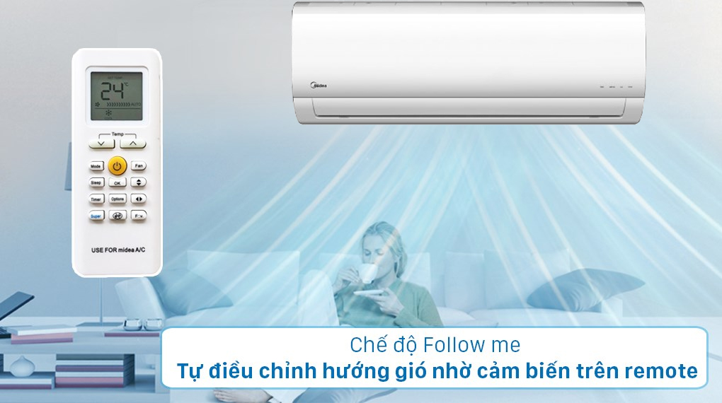 Khi kích hoạt tính năng Follow me và đặt remote bên bên cạnh, remote sẽ cảm nhận nhiệt độ xung quanh nhờ vào cảm biến nhiệt tích hợp, sau đó sẽ gửi tín hiệu về dàn lạnh, máy lạnh sẽ tự điều chỉnh công suất phù hợp và chuyển cánh đảo gió về phía remote, tạo không gian mát lạnh xung quanh người dùng.