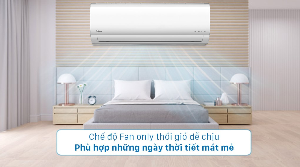 Với chế độ thổi gió, máy lạnh Midea chỉ hoạt động ở bộ phận cánh quạt gió, thổi gió để làm mát không gian, không thổi hơi lạnh, phù hợp với người già và trẻ nhỏ có làn da nhạy cảm.