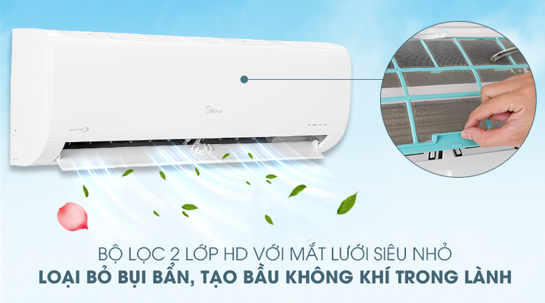 Với thiết kế siêu nhỏ của bộ lọc bụi 2 lớp HD trên máy lạnh Midea, bụi bẩn và các tác nhân gây dị ứng như: lông thú cưng, phấn hoa,... Có trong không khí sẽ được lọc sạch, bảo vệ sức khỏe và mang đến không khí trong lành cho người sử dụng.