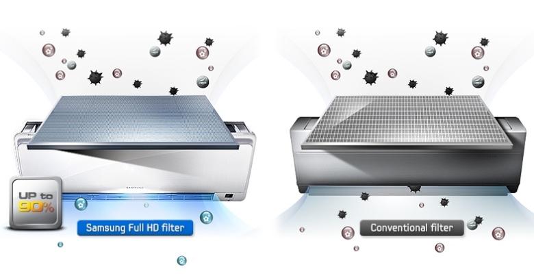 Để bảo vệ sức khỏe người dùng, tránh những bệnh về đường hô hấp, ngoài tính năng làm mát, Samsung còn rất quan trong đến khả năng diệt khuẩn trên máy lạnh. Máy lạnh Samsung AR09JCFSSURNSV được trang bị bộ lọc Full HD, cấu tạo từ vô số lưới lọc có phủ lớp kháng khuẩn. Nhờ đó, vi khuẩn, nấm mốc, bụi bẩn…và các thành phần gây hại khác trong không khí sẽ được lọc sạch, mang đến bầu không khí trong lành, tinh khiết và an toàn nhất.