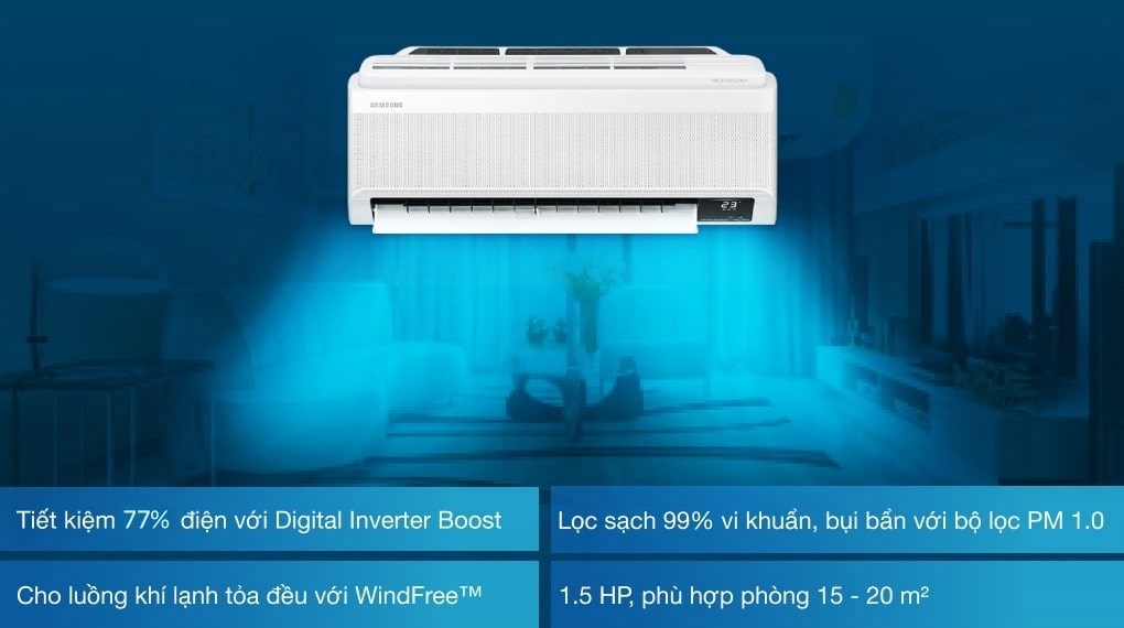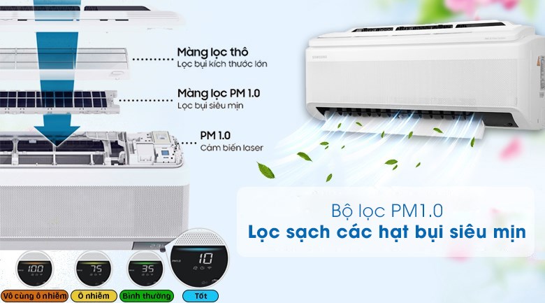 Máy lạnh được Samsung trang bị bộ lọc PM1.0, giúp lọc sạch hiệu quả các hạt bụi siêu mịn trong không khí với kích thước siêu nhỏ, giữ bầu không khí trong lành, bảo vệ sức khỏe gia đình bạn tốt hơn.