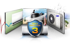 Chế độ làm lạnh nhanh Turbo CoolingMáy lạnh vận hành chế độ làm lạnh nhanh ở tốc độc cực đại để nhanh chóng mang đến nhiệt độ mong muốn. Không khí mát lạnh nhanh chóng lan tỏa vào không gian với công nghệ Tuabin làm mát của Samsung. | Bộ 3 bảo vệ Triple ProtectorCông nghệ bảo vệ tích hợp của Samsung mang đến sự tin cậy và lâu bền tốt hơn. Hệ thống làm mát mạnh (Bộ bảo vệ máy nén Engine protector), điều khiển dòng điện tức thì (Bộ bảo vệ điều khiển Controller protector), lớp phủ chống ăn mòn hiệu quả (Bộ tản nhiệt chống rỉ Fin protector - anti corrosion) cho phép bạn có được một không khí mát lạnh sảng khoái trong khoảng thời gian dài. | Tính năng hút ẩmMáy lạnh Samsung sẽ ngăn căn phòng của bạn trở nên ẩm thấp và oi bức. Đây là sự lựa chọn thích hợp nhất để loại bỏ độ ẩm trong môi trường của bạn. |