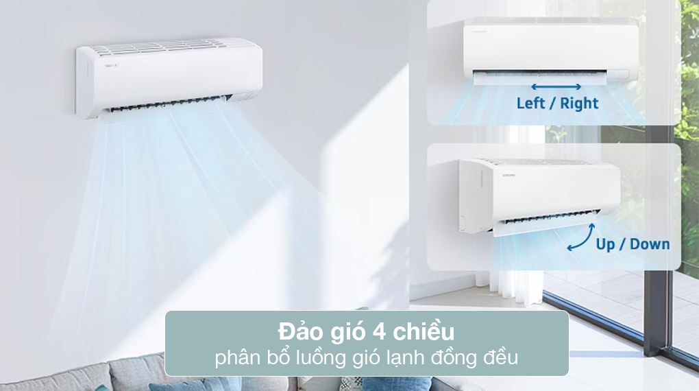 Máy lạnh Samsung AR50H10D1BHNSV được trang bị khả năng đảo gió 4 chiều lên xuống, trái phải tự động. Cách phân bổ luồng gió này giúp hơi mát lan tỏa đều hơn trong phòng, tránh tình trạng lạnh tập trung ở một vị trí cố định.