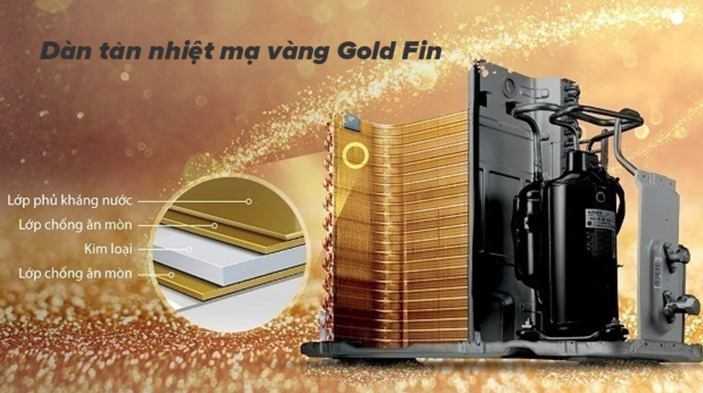 Cả dàn lạnh và dàn nóng đều sử dụng ống dẫn gas bằng đồng có hiệu quả truyền nhiệt tốt. Ngoài ra, dàn tản nhiệt làm bằng chất liệu nhôm và được mạ vàng Gold Fin có khả năng chống ăn mòn cao, tăng cường quá trình trao đổi nhiệt để máy lạnh tủ đứng LG hoạt động hiệu quả hơn.