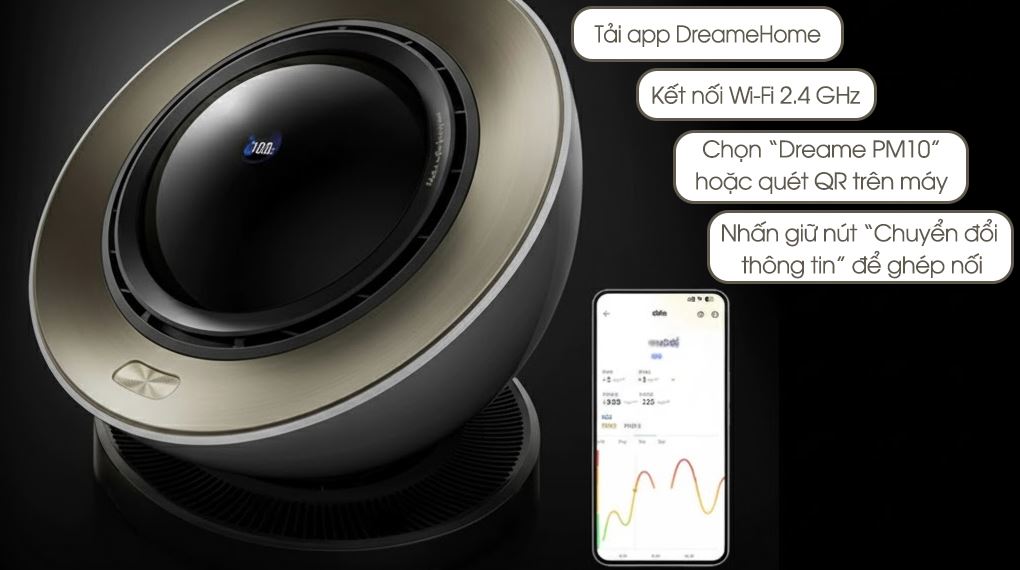 Ngoài ra, Dreame PM10 hỗ trợ kết nối với ứng dụng DreameHome, giúp bạn quản lý thiết bị mọi lúc mọi nơi. Bạn có thể theo dõi nồng độ bụi, nhận cảnh báo chất lượng không khí theo thời gian thực, điều chỉnh chế độ lọc, hẹn giờ bật/tắt hoặc điều khiển bằng giọng nói (tiếng Anh), vô cùng tiện lợi cho những ai bận rộn hoặc thường xuyên di chuyển.