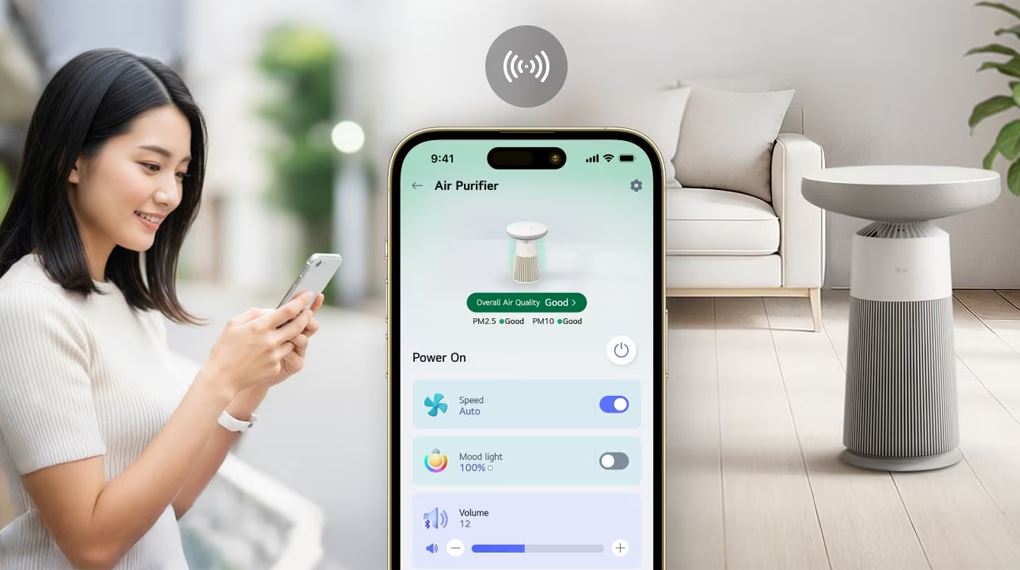 Máy hỗ trợ kết nối với ứng dụng LG ThinQ, cho phép điều khiển bằng điện thoại, theo dõi chất lượng không khí, thay đổi chế độ từ xa và nhận cảnh báo thay bộ lọc. Chức năng chẩn đoán thông minh (Smart Diagnosis) hỗ trợ kiểm tra nhanh tình trạng thiết bị, hữu ích khi cần hỗ trợ kỹ thuật.