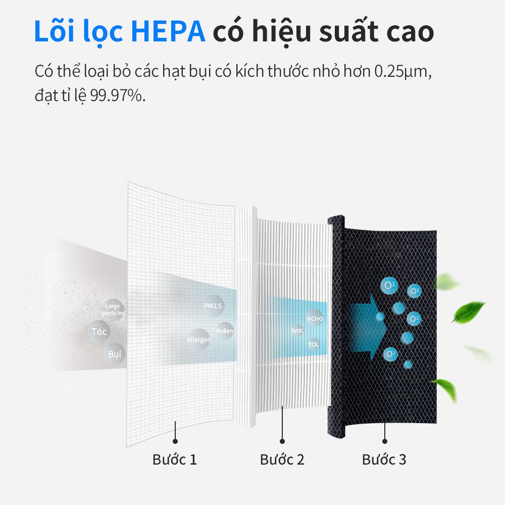 - Lớp lọc HEPA H11: Với hiệu suất lọc lên đến 99.97% các hạt bụi siêu nhỏ kích thước chỉ 0.25 µm, bao gồm bụi mịn PM2.5, vi khuẩn, nấm mốc và virus. Đây là tấm chắn quan trọng bảo vệ sức khỏe hô hấp của bạn.