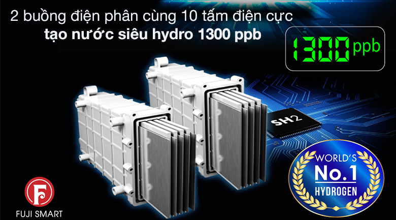 - Các máy lọc nước điện giải thế hệ trước thường chỉ có 1 buồng điện giải. Fuji Smart i9 sở hữu 2 buồng điện giải kép thông minh với hiệu suất siêu khủng: Buồng Hi và Buồng Ki tổng cộng đến 10 tấm điện cực. Công nghệ điện giải Siêu Hydro (Super Hydrogen) tạo nguồn nước với nồng độ Hydrogen đạt đến ngưỡng 1300 ppb, cao nhất thế giới.