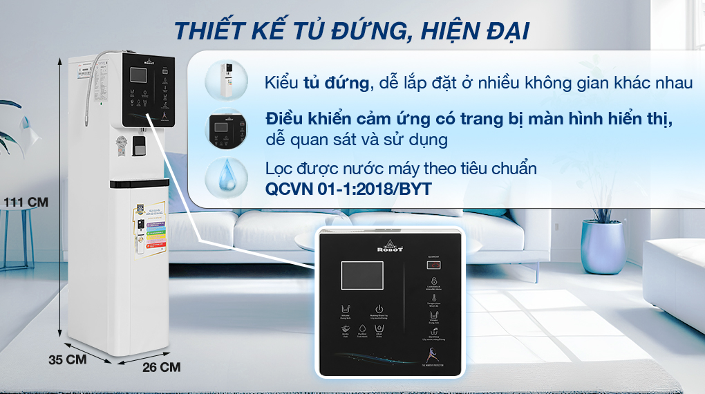 - Mẫu máy lọc nước ROBOT này thiết kế tủ đứng, vỏ tủ chất liệu nhựa ABS bền tốt, có thể bố trí linh hoạt cho mọi không gian từ nhà bếp, phòng ăn đến phòng khách hay không gian văn phòng,...