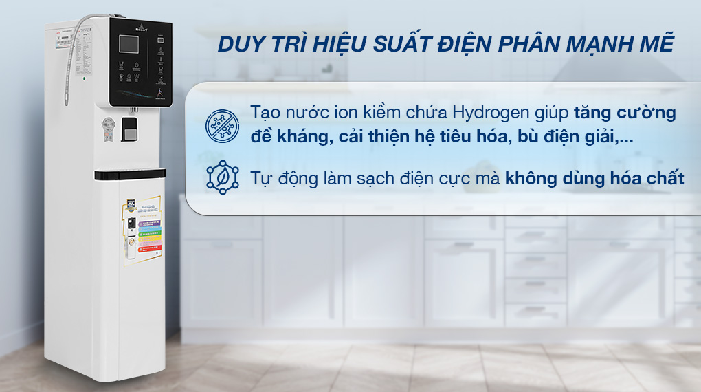 - Sử dụng phương pháp điện phân liên tục (Korea thế hệ mới) có khả năng tạo ra đến 9 loại nước đa chức năng: 5 mức nước ion kiềm (pH 8.5 - 10.5), nước trung tính nóng - nguội - lạnh (pH 7.0) và 3 mức nước ion axit (pH 4.5 - 5.5). Nước ion kiềm giàu Hydrogen giúp tăng cường hệ miễn dịch cho cơ thể, hỗ trợ tiêu hoá (giảm tình trạng ợ chua, đầy bụng,...), làm chậm quá trình lão hoá,...