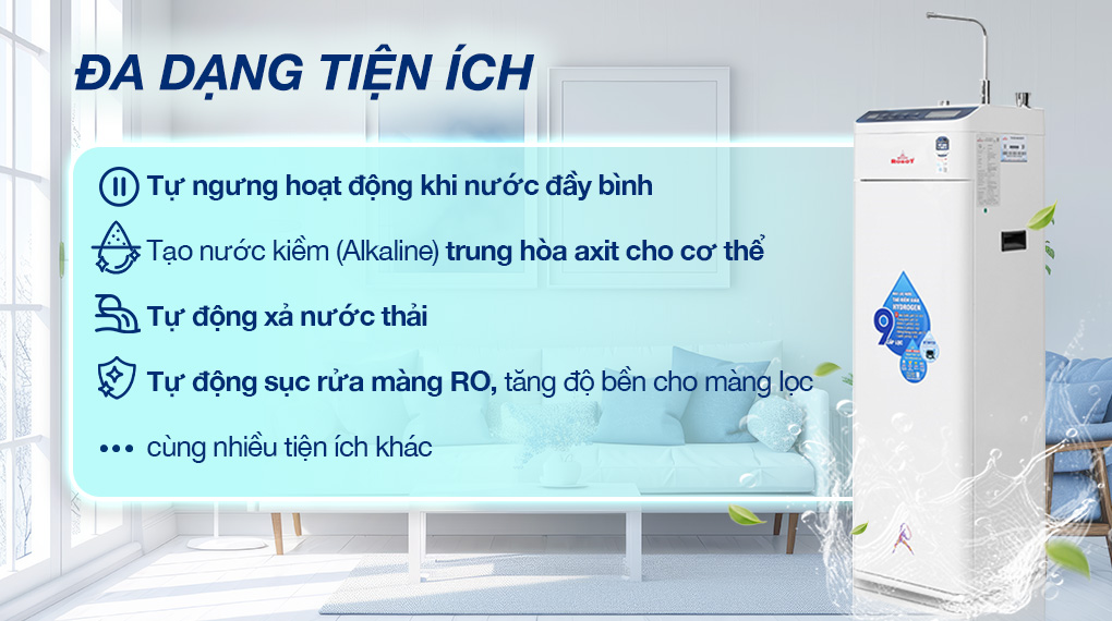 - Tính năng tự động sục rửa màng RO giúp kéo dài tuổi thọ và đảm bảo hiệu suất màng lọc.