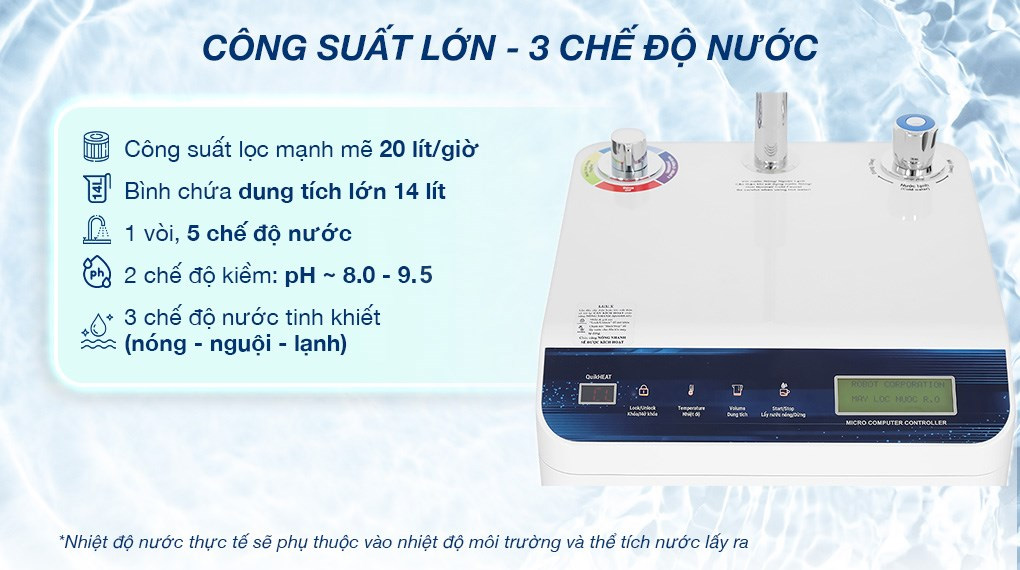 - Công nghệ vi điều khiển RMC - Màn hình LCD hiển thị 24/24 thiết kế độc quyền bởi ROBOT giúp loại trừ mọi rủi ro ngoài kiểm soát, hiển thị tình trạng hoạt động của máy: chất lượng nước (chỉ số TDS) trước và sau khi lọc, hiển thị tuổi thọ và cảnh báo thay lõi, ngưng hoạt động khi thiếu nước hoặc nước đầy, tự động ngắt khi hoạt động liên tục quá 5 giờ, lựa chọn dung tích và nhiệt độ nước nóng,...
