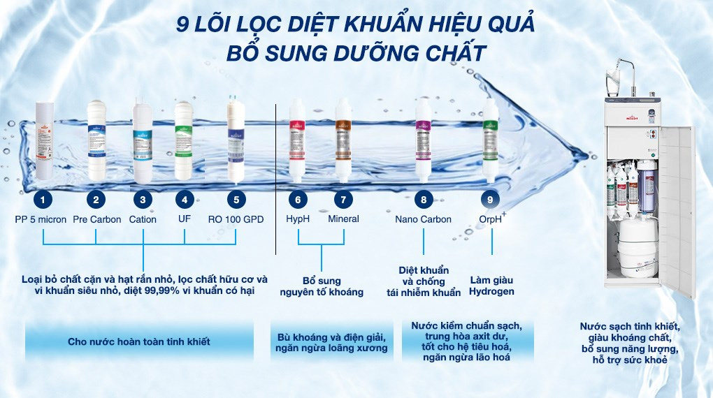 - Lõi RO 100 GPD (Sx Đài Loan - màng lọc Sumitomo Nhật Bản): loại bỏ 99.99% các chất có hại, cho nước hoàn toàn tinh khiết.