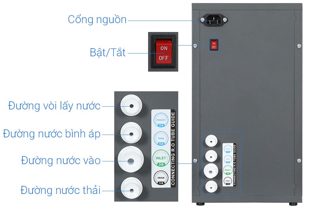 Tổng thể máy lọc nước có kích thước gọn gàng, bố cục các lõi lọc được sắp xếp hợp lý, thuận tiện cho việc kiểm tra và thay thế định kỳ khi cần thiết.
