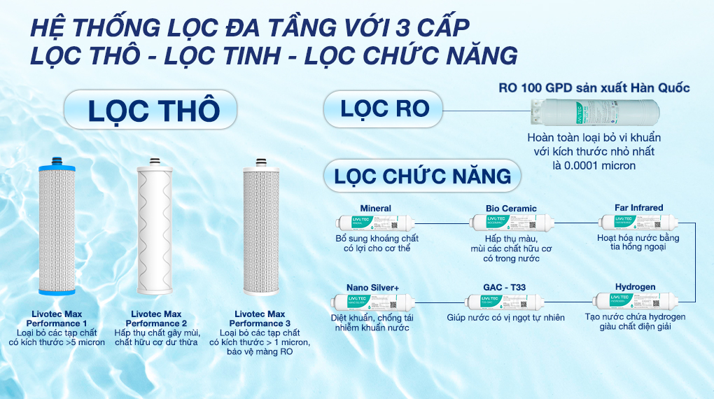 - Lõi Livotec Max Performance 3 (Sx Việt Nam): Loại bỏ các chất như rong rêu, cặn bẩn, bụi cát, chất rắn có kích thước trên 1 micromet.