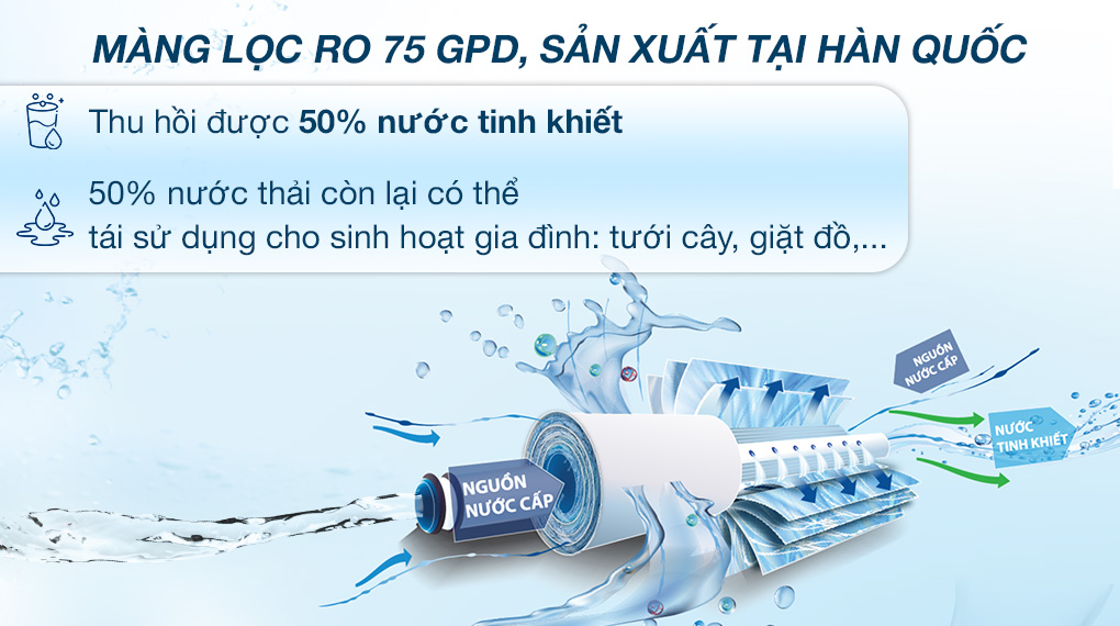 - Lõi RO 75 GPD (Sx Hàn Quốc): Loại bỏ được tới 99.99% sạn cát, rỉ sét, rong rêu, chất độc hữu cơ, cặn bẩn lơ lửng, virus, vi khuẩn, ion kim loại nặng,… trong nước.