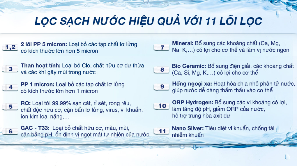 - Lõi Nano Silver (Sx Việt Nam): Tiêu diệt vi khuẩn, chống tái nhiễm khuẩn trong quá trình nước lưu thông trong hệ thống lọc.