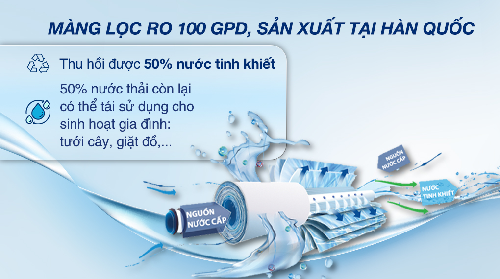 - Màng RO Thin Film Composite 100 GPD (Sx Hàn Quốc): Loại bỏ hơn 99.99% Clo, dầu, virus, vi khuẩn, amip, asen, các ion kim loại và các chất độc hại trong nước.